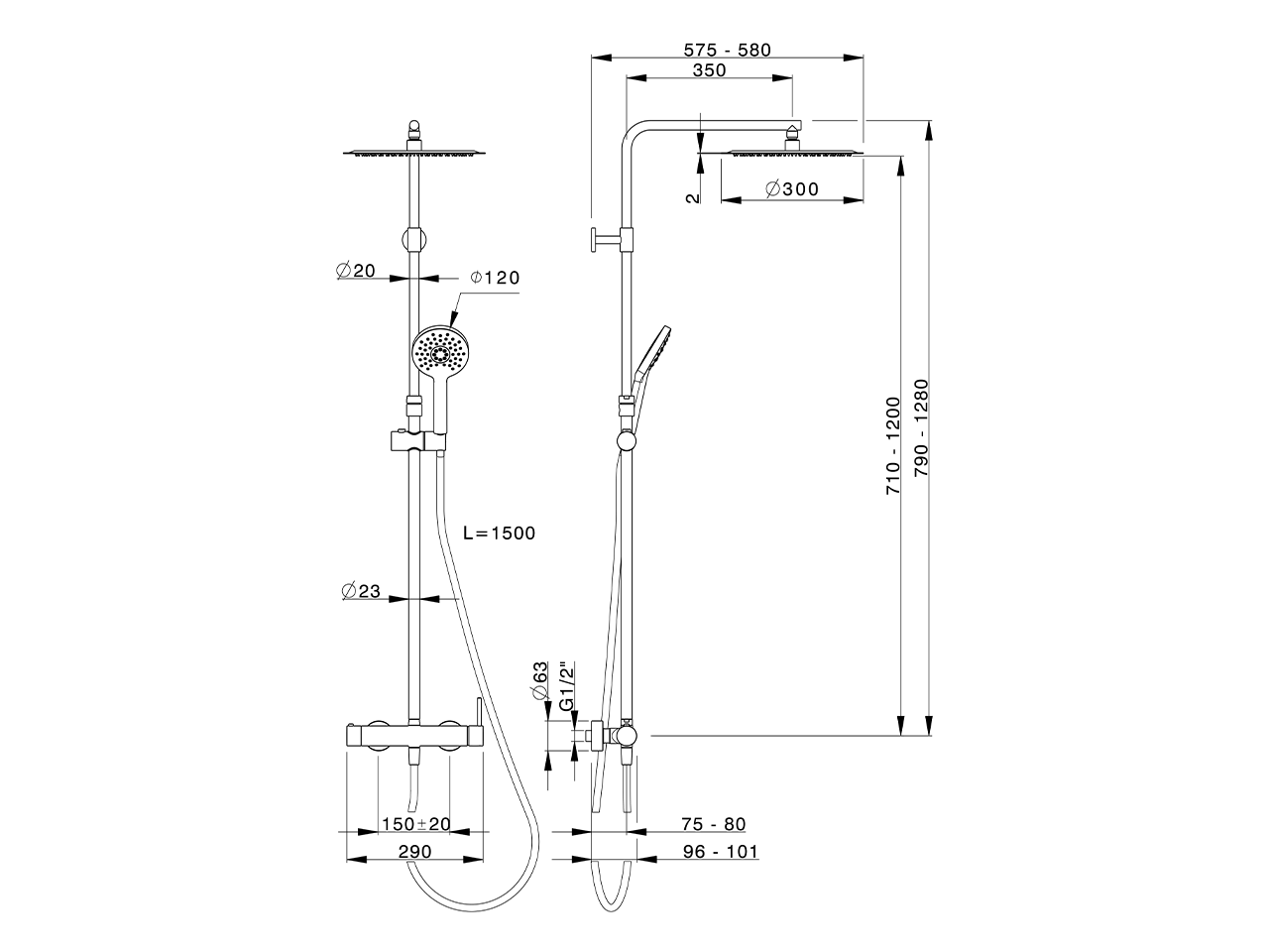 2-function single lever shower set,2-outlet deviastop,adjustable riser column,sliding shower bracket,120 mm ABS 3 sprays handshower,300 mm round showerhead 2 mm thick INOX,150 cm smooth SILVERFLEX Flexible Hose