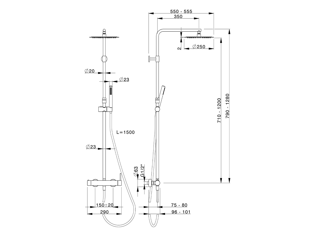 2-function single lever shower set,adjustable riser column,23 mm Brass One Spray handshower,250 mm round showerhead 2 mm thick INOX,150 cm smooth SUPREME Flexible Hose
