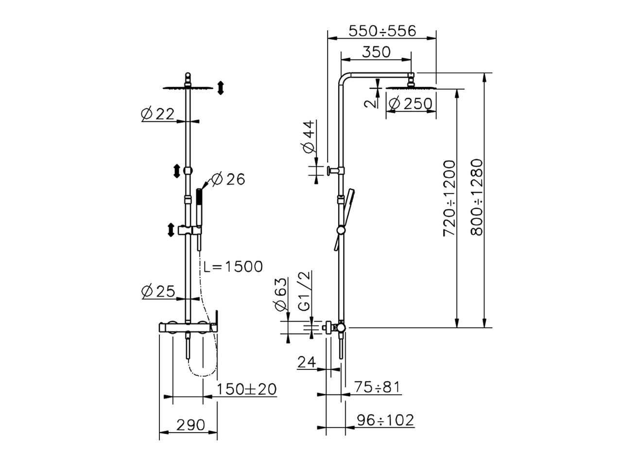 2-function single lever shower set,2-outlet deviastop,adjustable riser column,sliding shower bracket,ABS D.26 mm minimalistic one spray handshower,250 mm round showerhead 2 mm thick INOX,150 cm smooth SILVERFLEX Flexible Hose