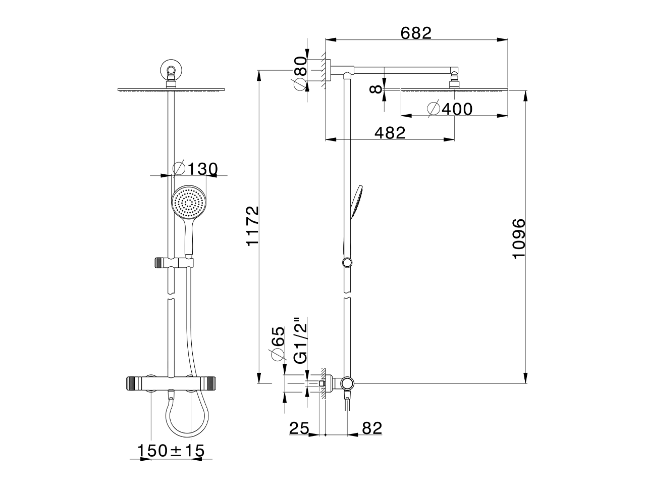 2-function Thermostatic shower set,2-outlet deviastop,not adjustable column,sliding handshower holder,130 mm ABS Emotion one spray handshower,D.400 mm 8 mm Brass thick round showerhead,150 cm SUPREME smooth flexible hose