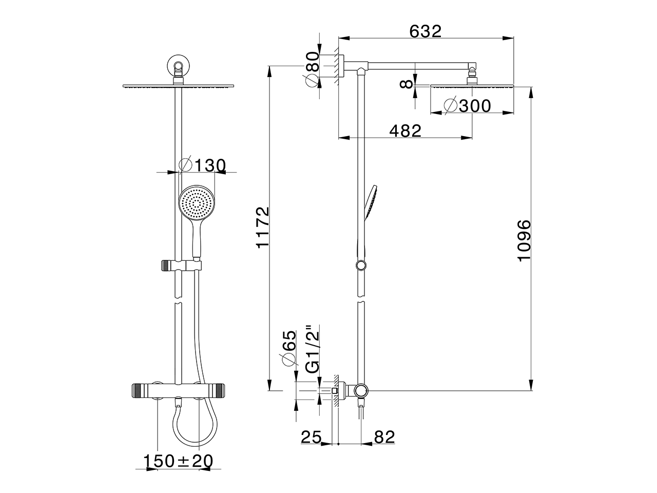 2-function Thermostatic shower set,2-outlet deviastop,not adjustable column,sliding handshower holder,130 mm ABS Emotion one spray handshower,D.300 mm 8 mm Brass thick round showerhead,150 cm SUPREME smooth flexible hose