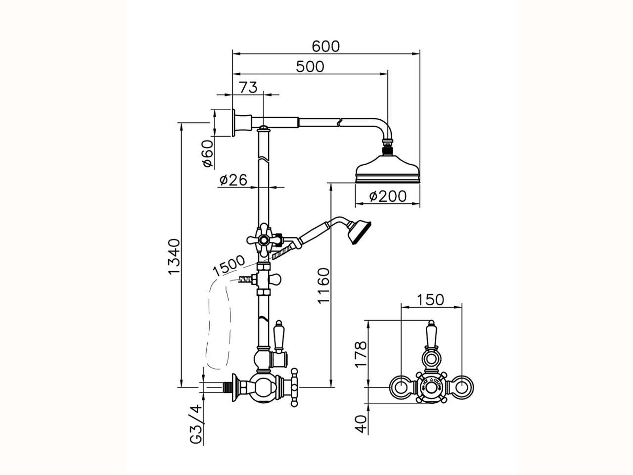2-function Thermostatic shower set,2-outlet diverter,not adjustable Column,sliding handshower bracket,78 mm Brass Classic one spray handshower,200 mm Brass round showerhead,150 cm Brass flexible hose