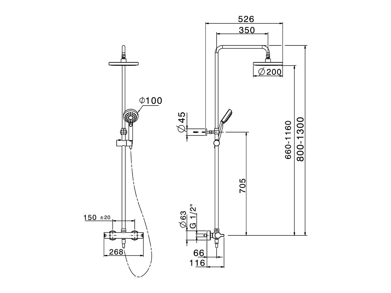 2-function Thermostatic shower set,2-outlet deviastop,adjustable riser column,sliding shower bracket,D.100 mm ABS 5 sprays handshower,D.200 mm ABS round showerhead,150 cm brass flexible hose