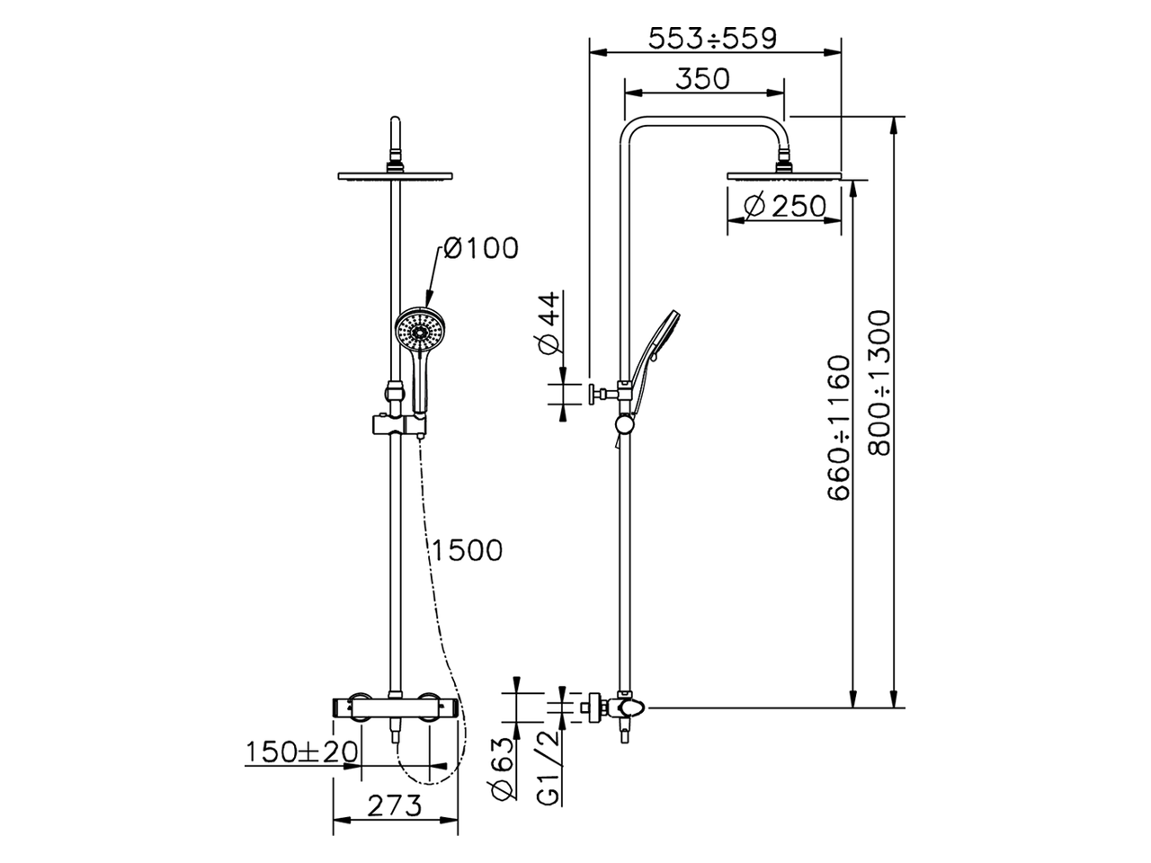 2-function Thermostatic shower set,2-outlet deviastop,adjustable riser column,sliding handshower bracket,100 mm ABS 3 sprays handshower,250 mm ABS round showerhead,150 cm smooth SILVERFLEX Flexible Hose