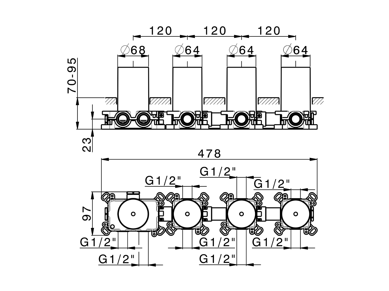 3 Function thermostatic concealed valve,ON/OFF button with flow rate regulation,with protection guard boxes,to match with exposed parts: 1 Thermo 3Push&Shower,without Thermo/Push&Shower exposed parts