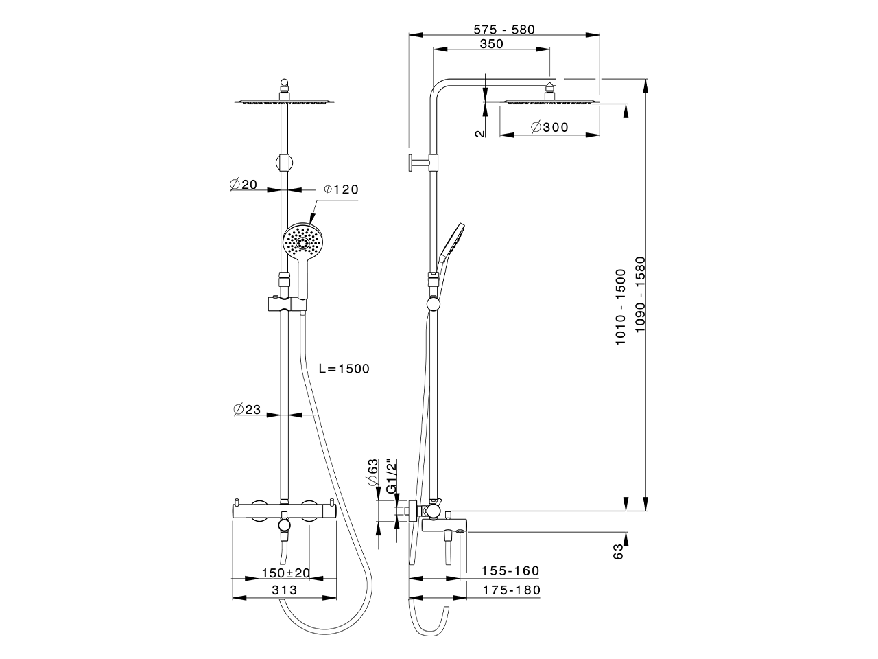 3-function Thermostatic shower set,2-outlet deviastop,adjustable riser column,sliding handshower holder,120 mm ABS 3 sprays handshower,300 mm round showerhead 2 mm thick INOX,150 cm smooth SILVERFLEX Flexible Hose