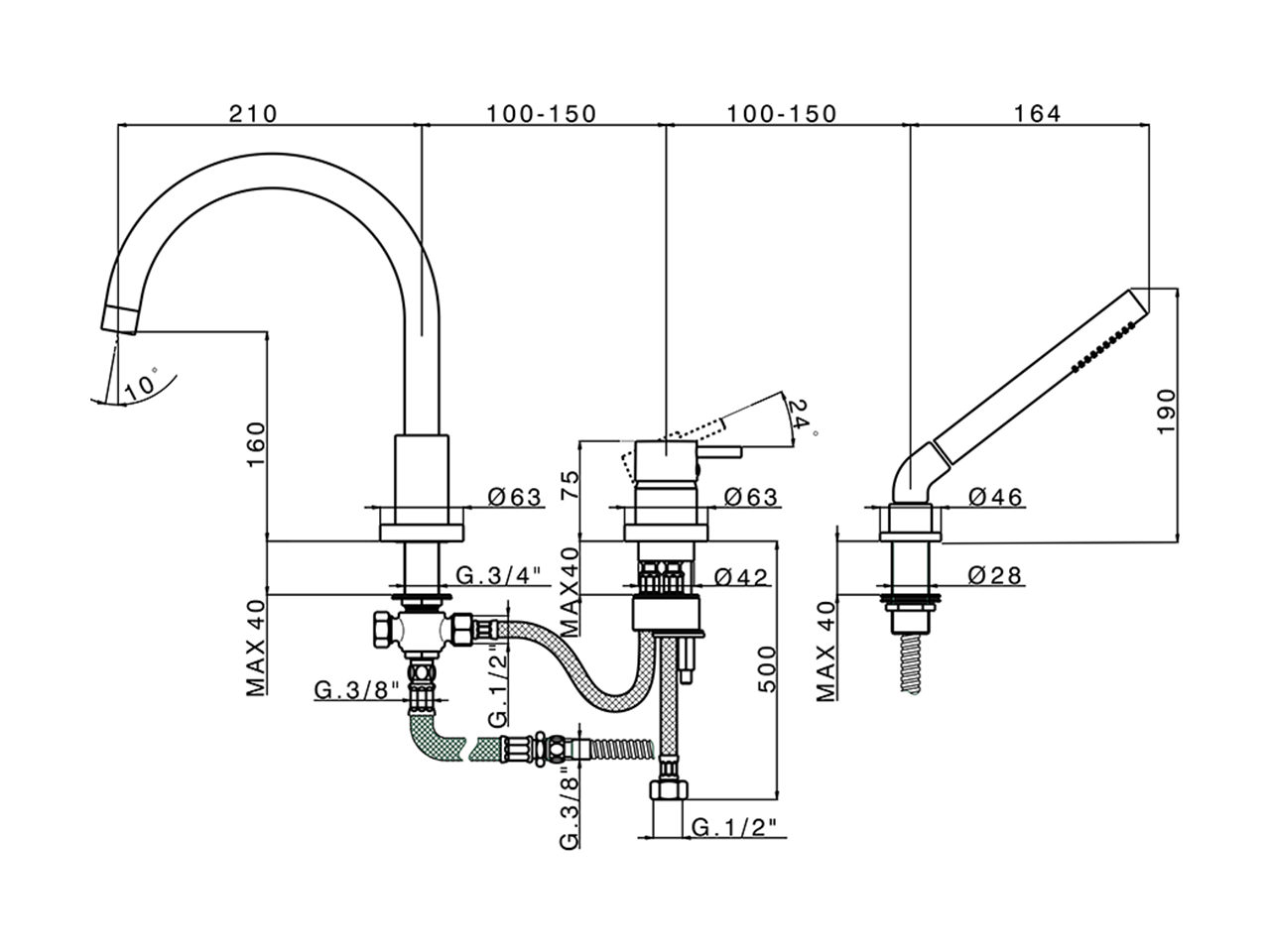 3-Hole deck mounted single lever bath mixer,automatic diverter,Brass One Spray handshower,175 cm Brass flexible hose