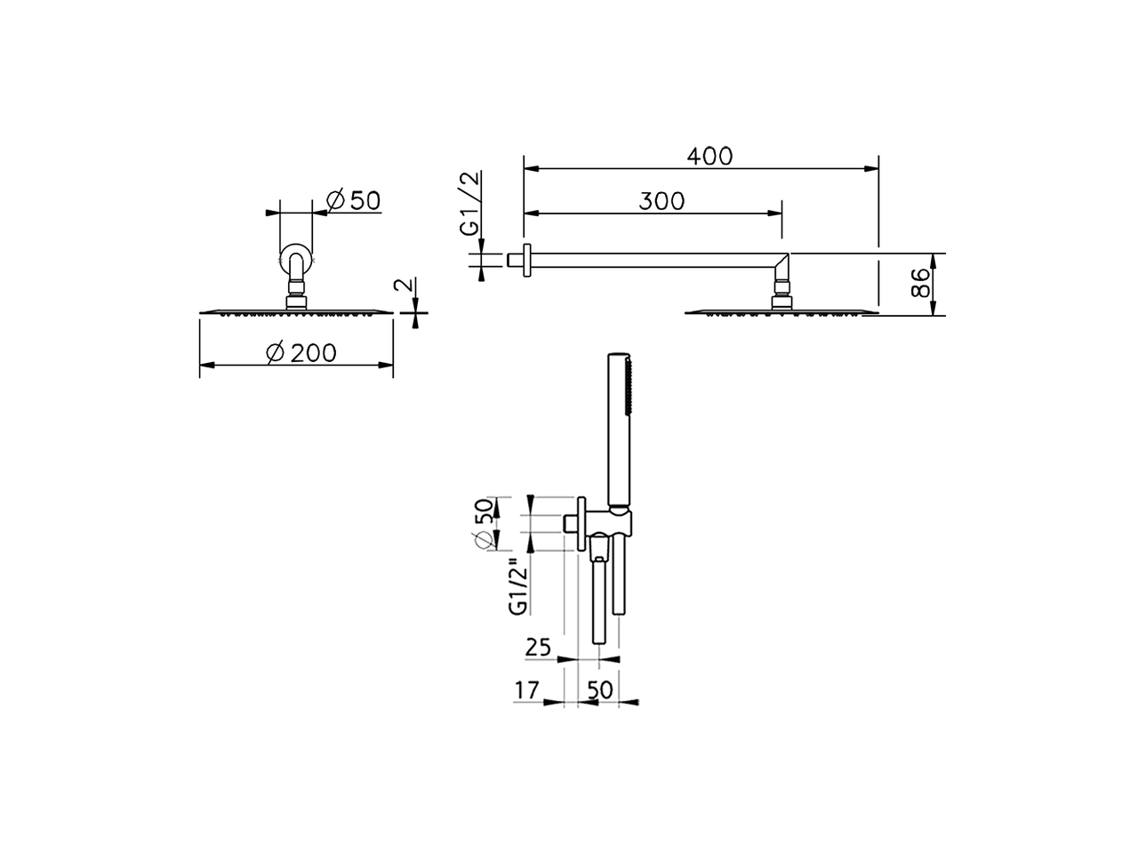 Arm and Shower Set with wall elbow integrated,300 mm shower arm,200 mm round showerhead 2 mm thick INOX,ABS D.26 mm minimalistic one spray handshower,1/2" wall elbow,150 cm smooth SILVERFLEX Flexible Hose