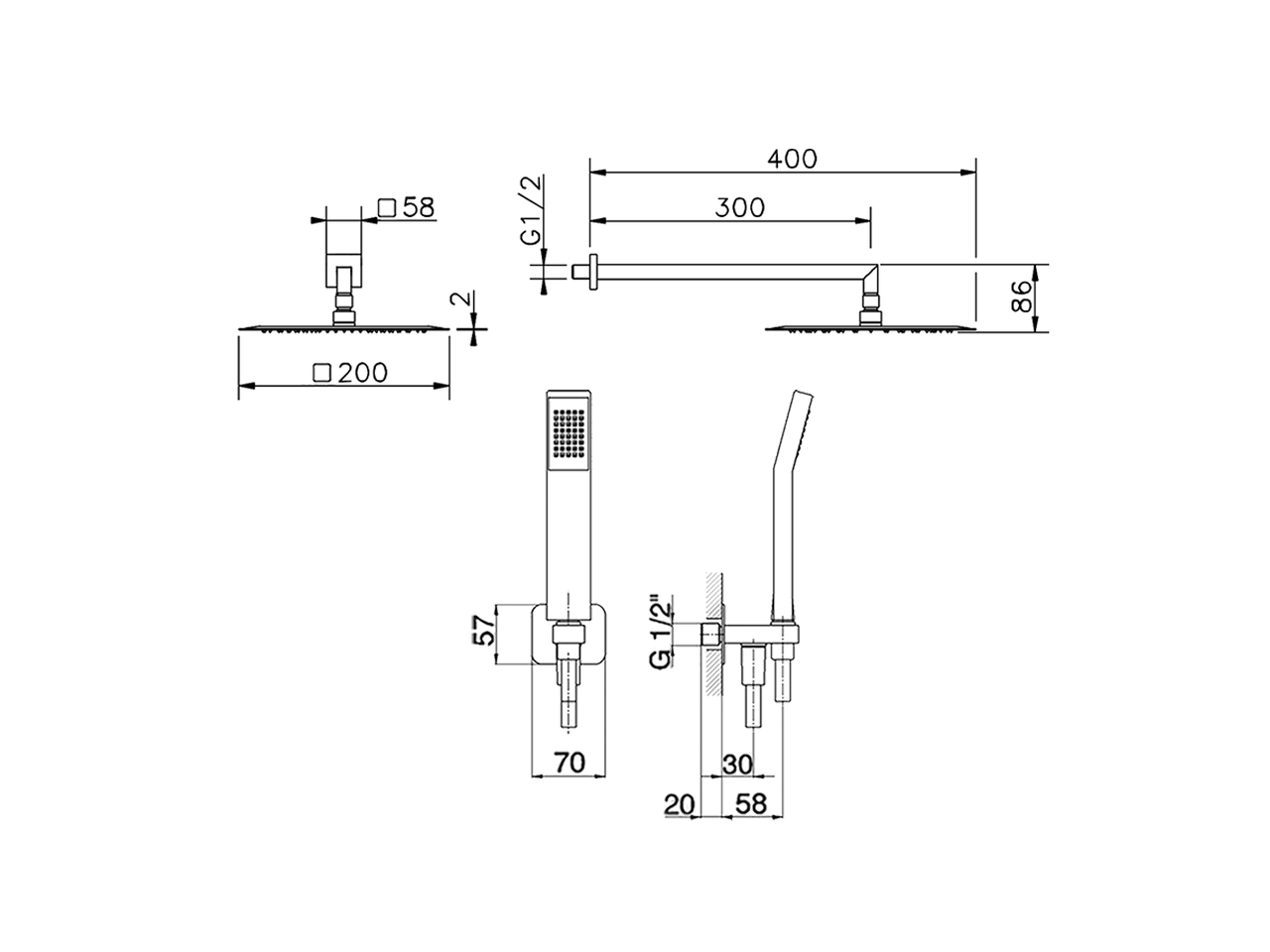 Arm and Shower Set with wall elbow integrated,300 mm shower arm,200x200 mm INOX square showerhead 2 mm thick,42x18 mm ABS Quad one spray handshower,1/2" wall elbow,150 cm smooth SILVERFLEX Flexible Hose