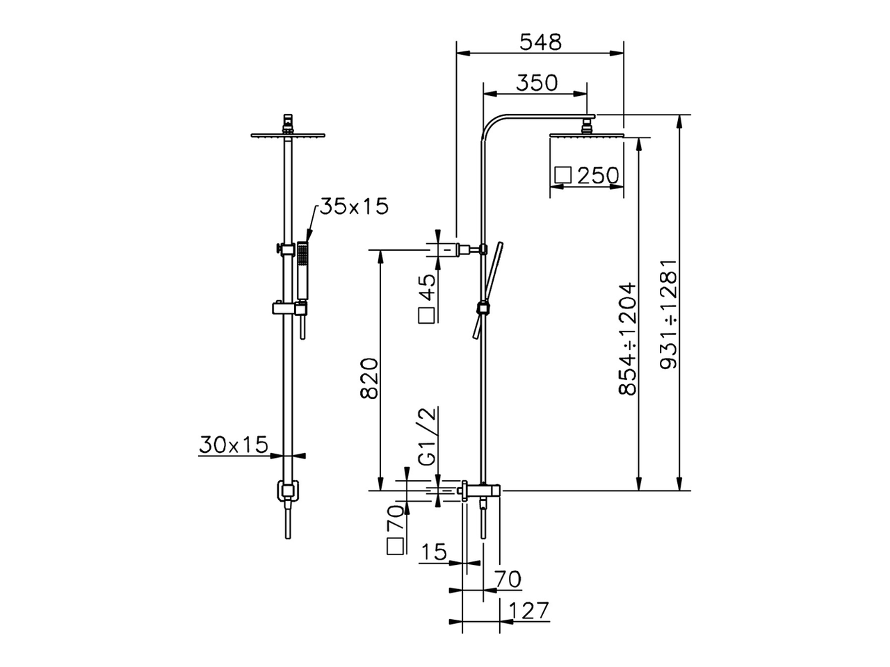 CombiShower with Diverter,2-outlet diverter with concealed wall elbow,adjustable riser column,sliding handshower holder,35x15 mm Brass minimalistic one spray handshower,250x250 BRASS Square headshower 8 mm thick,150 cm smooth SILVERFLEX Flexible Hose