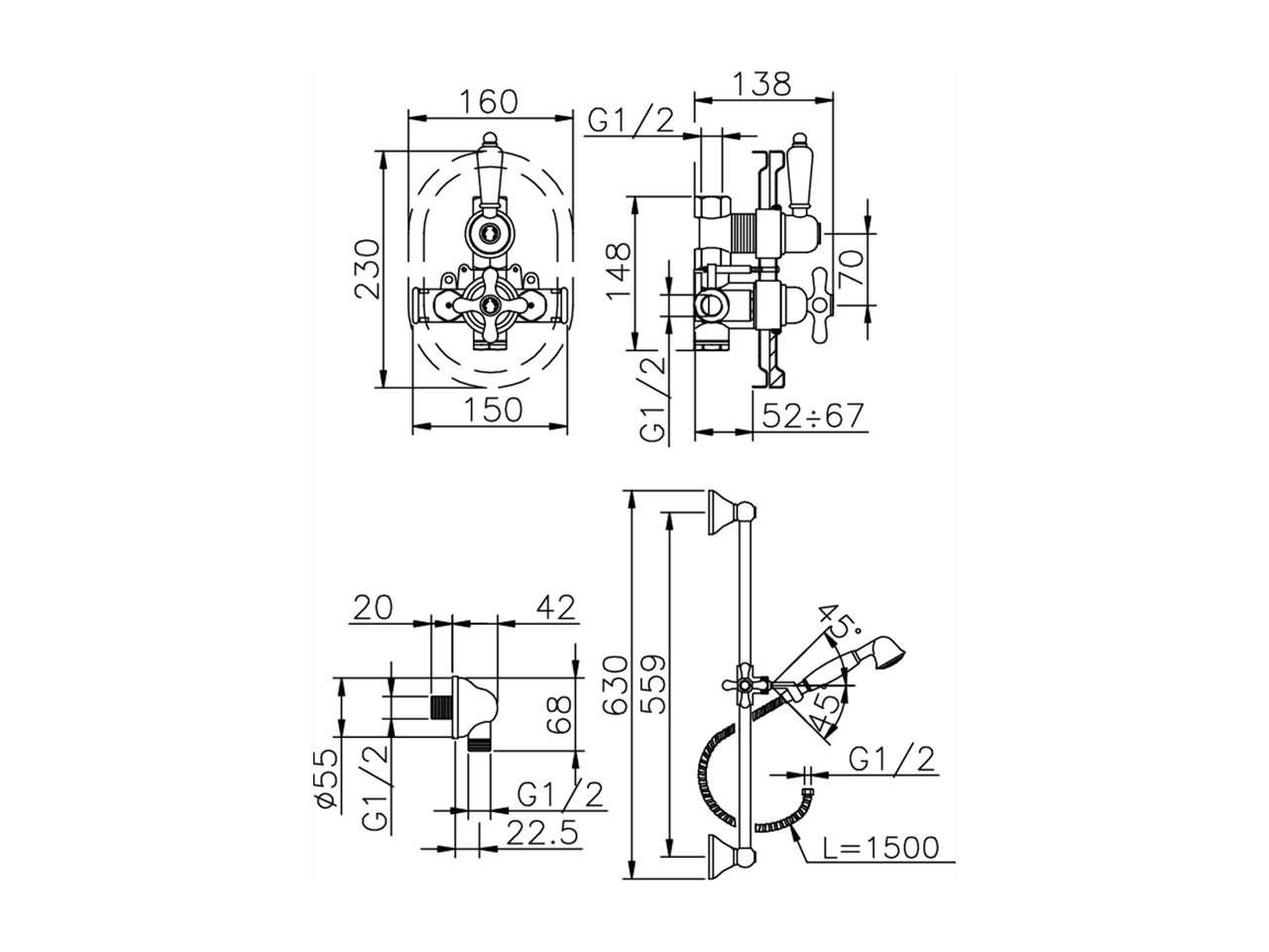 Concealed thermostatic shower mixer,1/2" Concealed Thermostatic Mixer,1/2" outlet stopvalve,56 cm bar with sliding bracket,classic D.53 mm brass one spray handshower,1/2" wall elbow,150 cm Brass flexible hose
