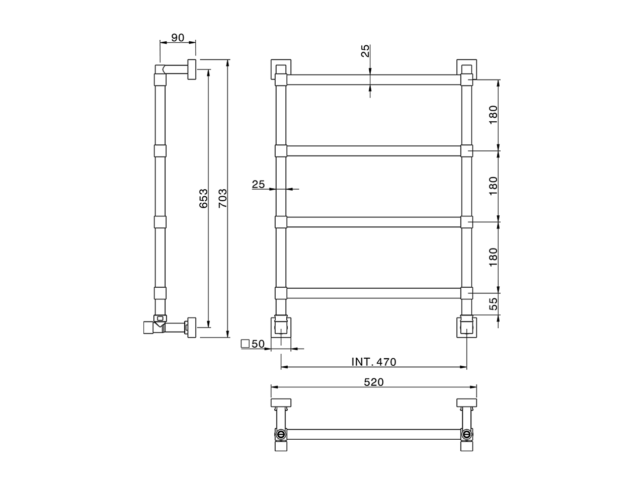 Fixed modular heated towel rail Ø25mm,30x30mm square details,1/2 M with eccentric union,Plumbing installation,Brass