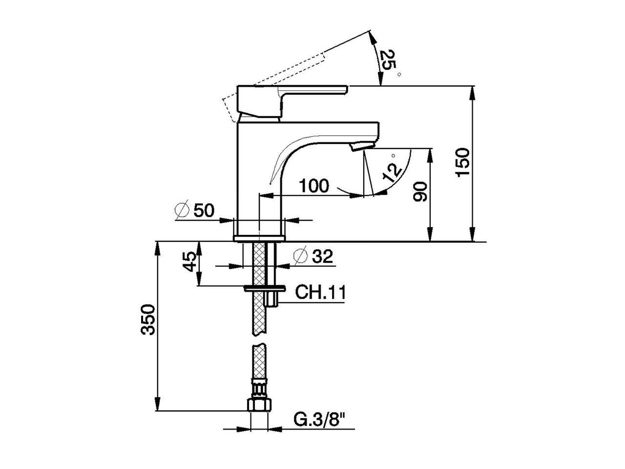 Single lever 'large' washbasin mixer,without waste,G.3/8" stainless steel flexible hoses