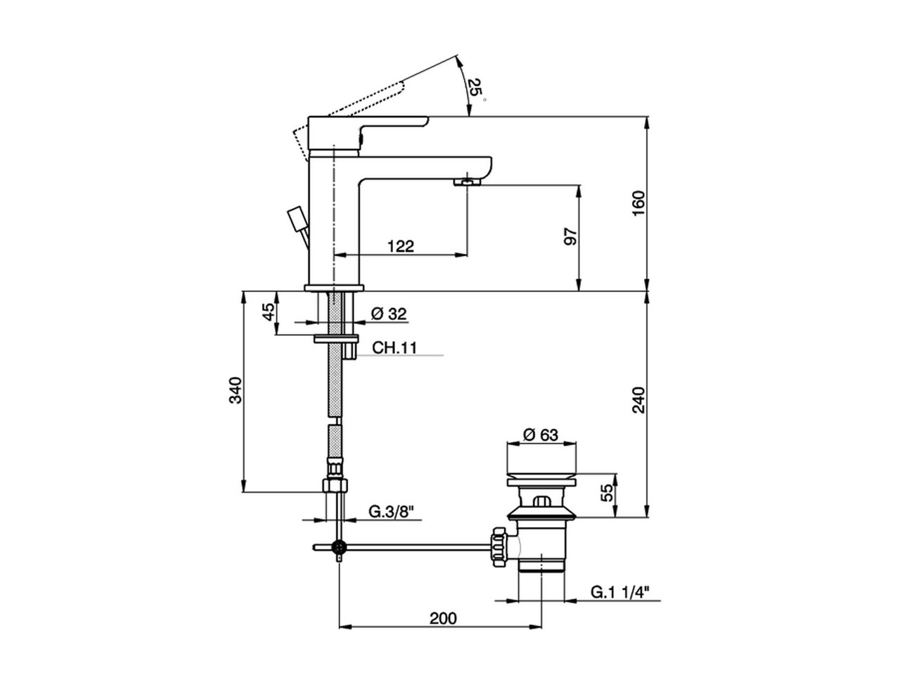 Single lever 'large' washbasin mixer,with 1"1/4 automatic pop up waste,G.3/8" stainless steel flexible hoses