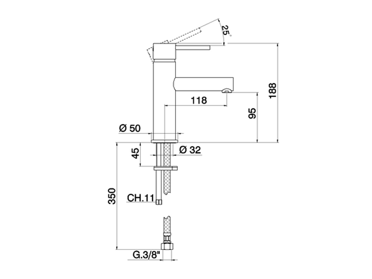 Single lever 'large' washbasin mixer,without waste,G.3/8" stainless steel flexible hoses