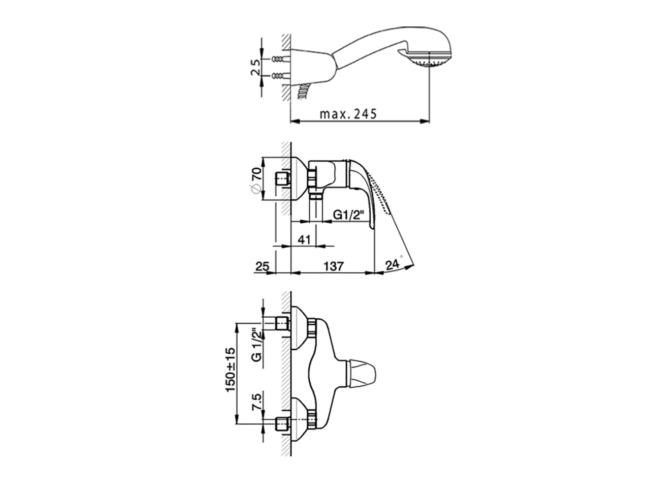Single lever shower mixer, with shower set,wall mounted adjustable handshower bracket,Teti ABS 3 sprays handshower,150 cm Brass flexible hose