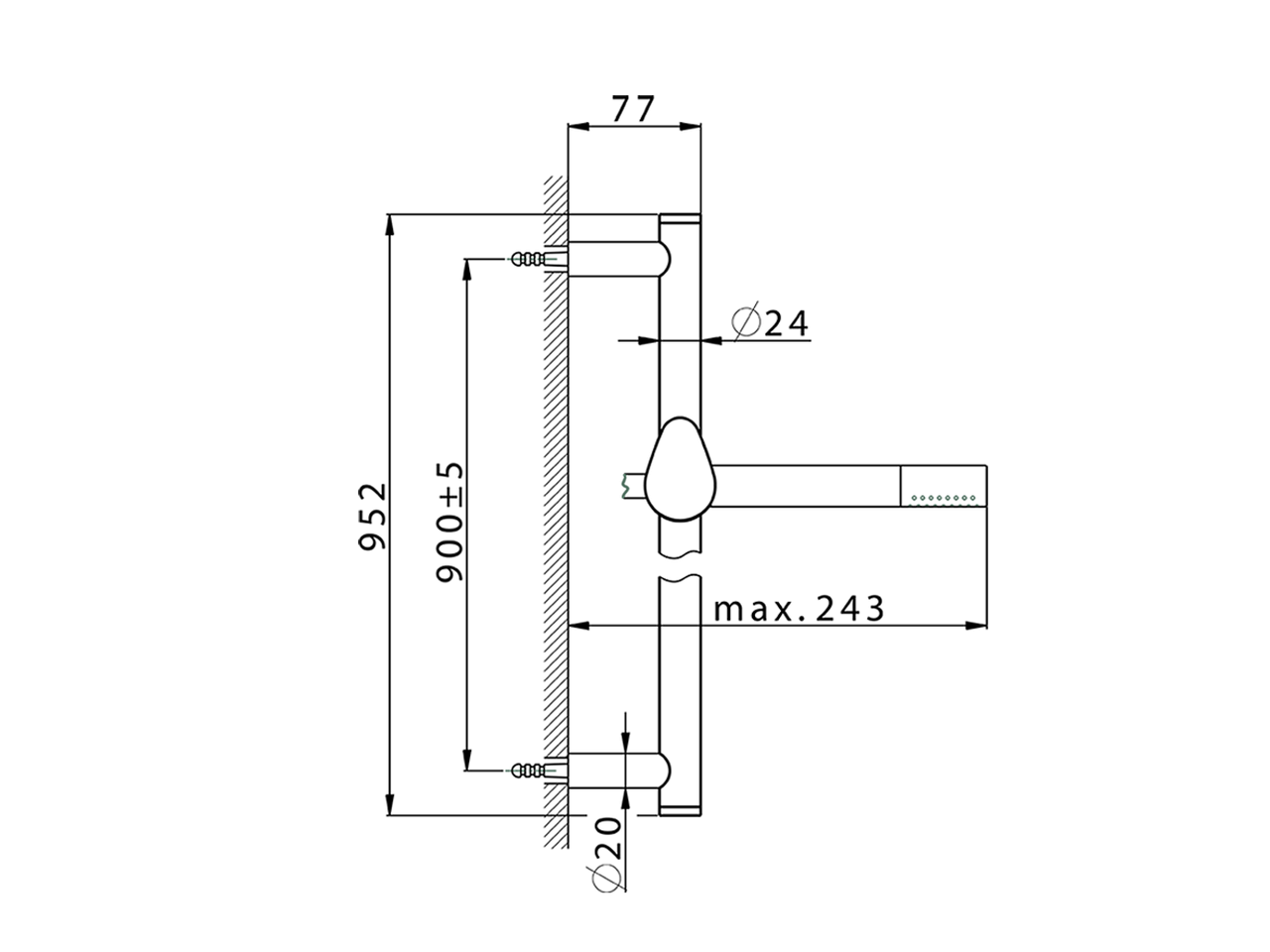 Slide rail shower set,90 cm Brass slide bar Ø24 w/brass slidingbracket,Brass D.24mm minimalistic one spray handshower,150 cm SUPREME smooth flexible hose
