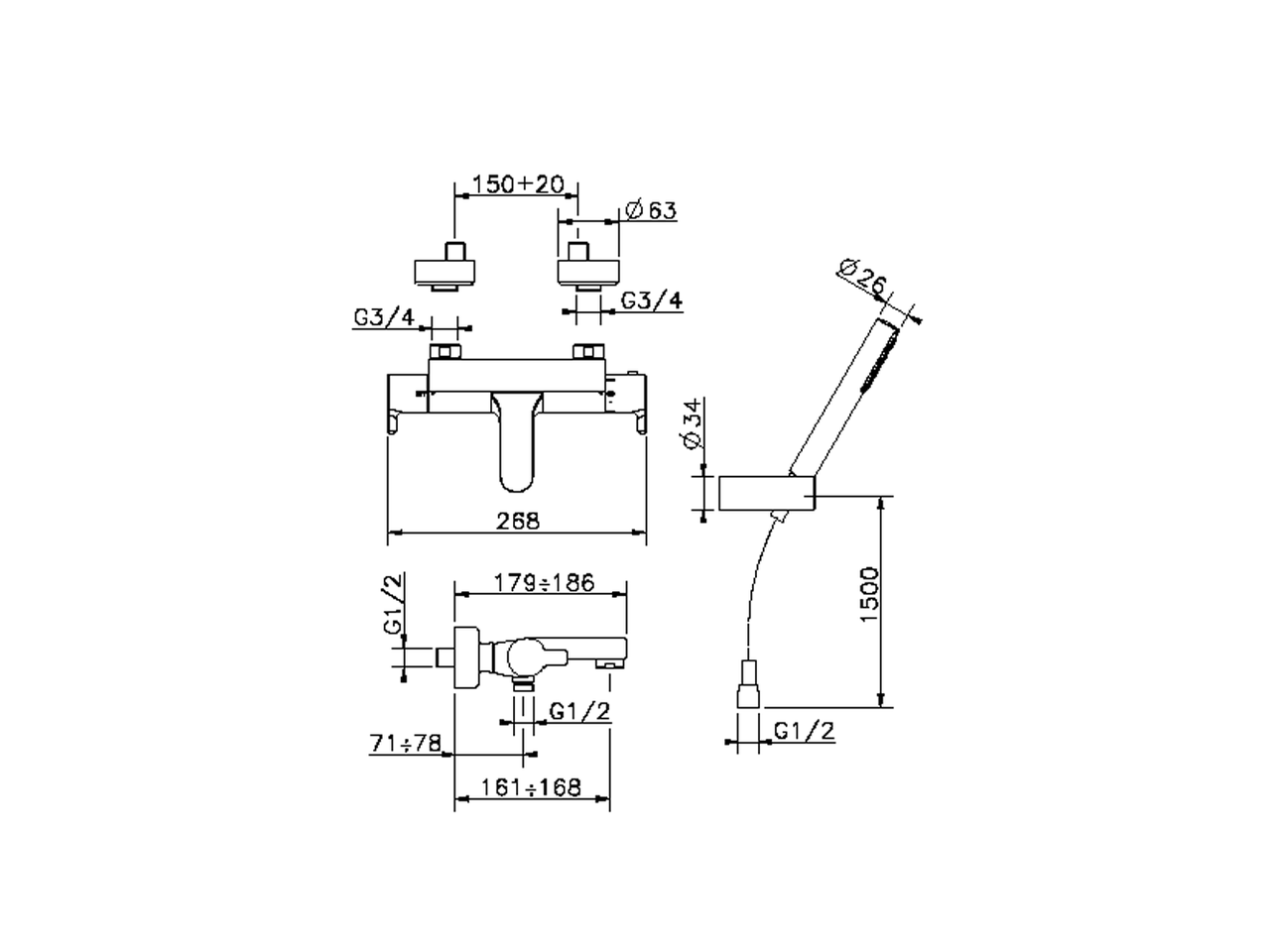 Thermostatic bath mixer, with shower set,wall mounted adjustable handshower bracket,ABS D.26 mm minimalistic one spray handshower,Brass 150 cm flexible hose