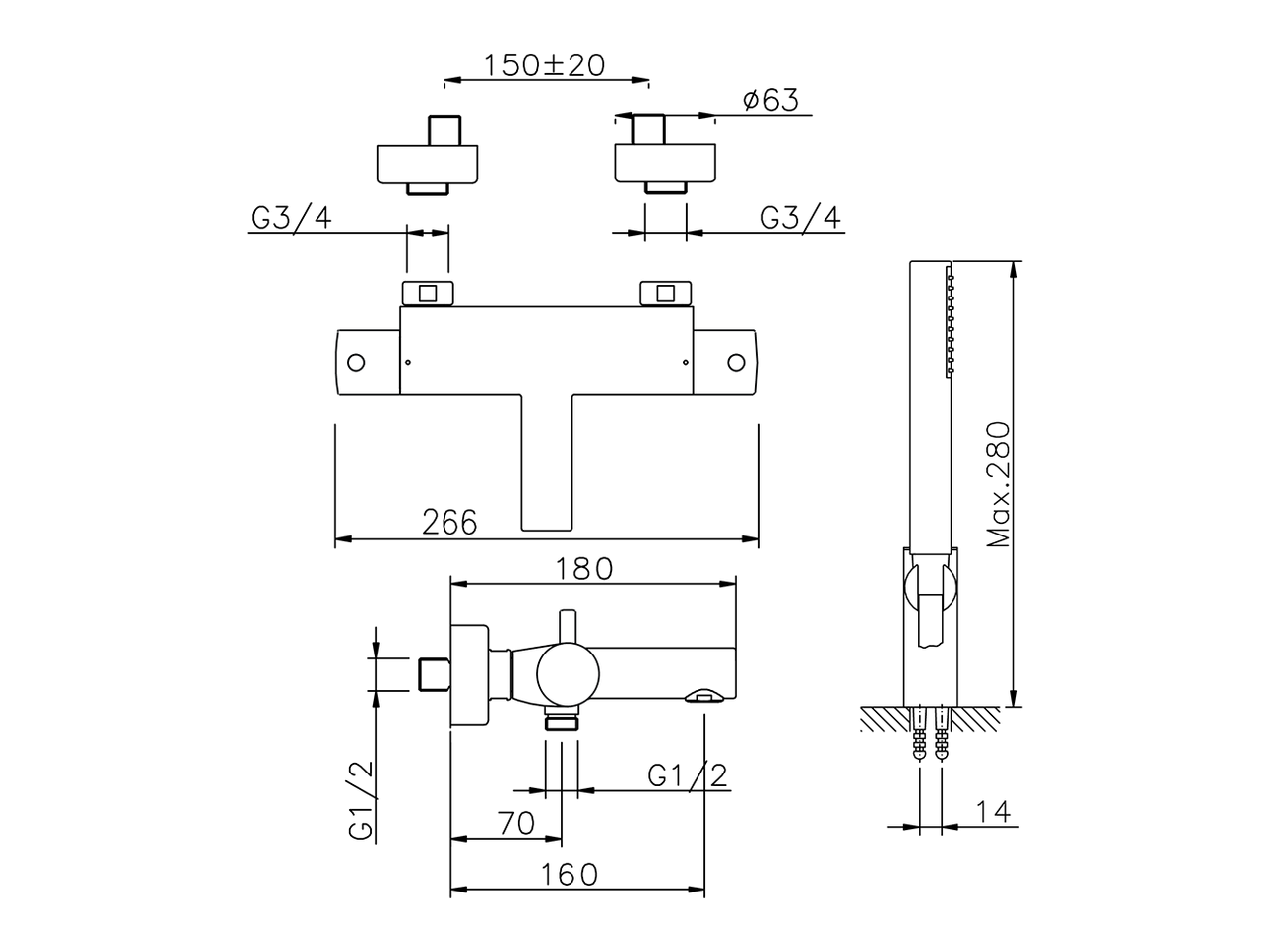 Thermostatic bath mixer, with shower set,wall mounted adjustable handshower holder,26 mm ABS Minimalistic One spray handshower,150 cm Brass flexible hose