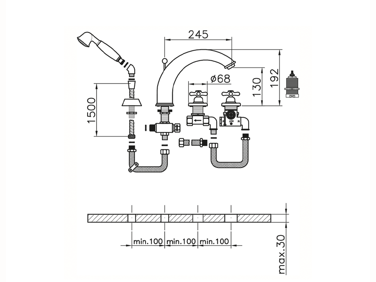 Thermostatic deck-mounted 4-hole mixer,2-outlet diverter,classic D.53 mm Brass one spray handshower,150 cm pull-out flexible hose