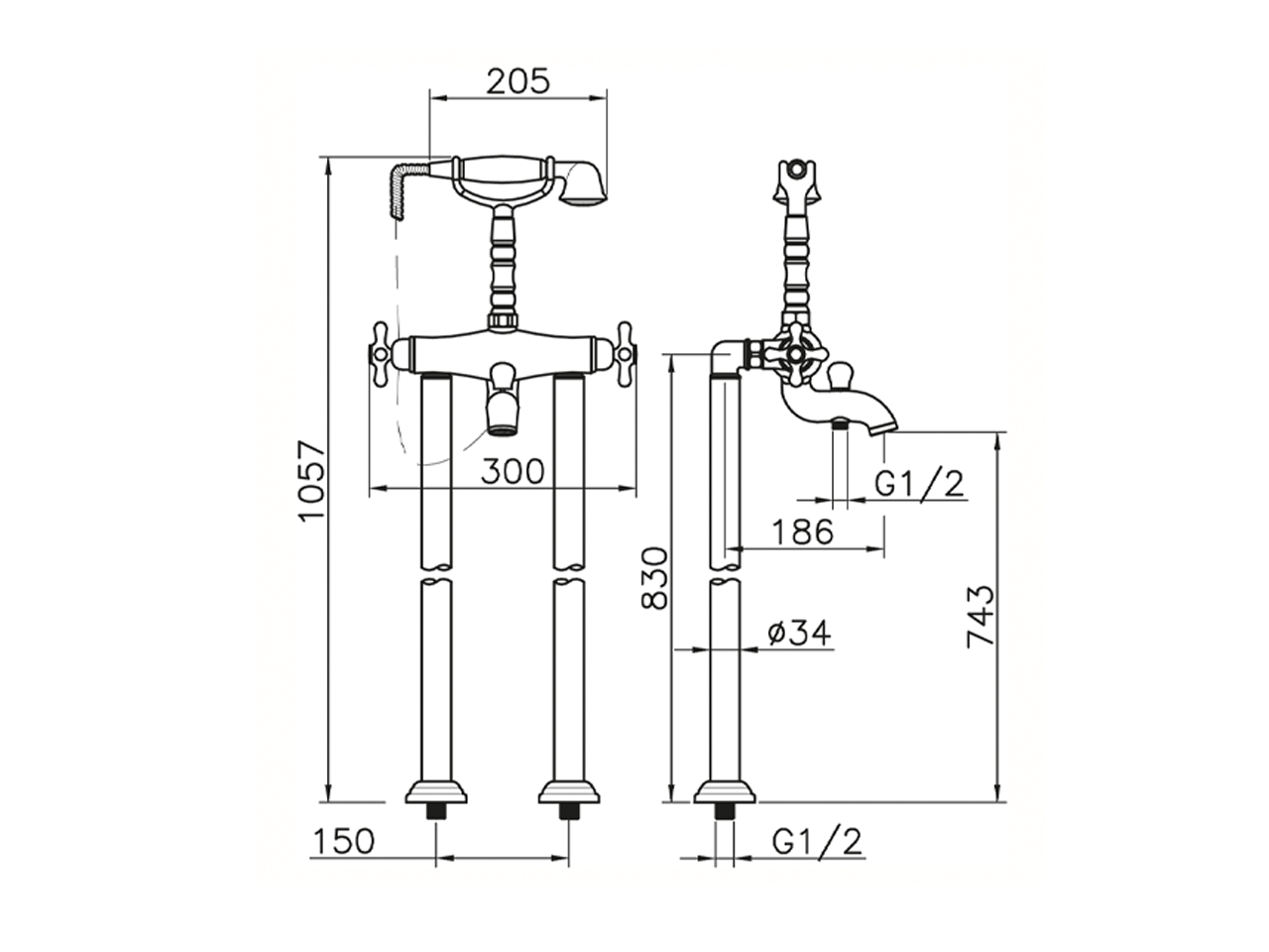 Thermostatic floor-mounted bath mixer,handshower bracket,classic D.53 mm Brass one spray handshower,Brass 150 cm.