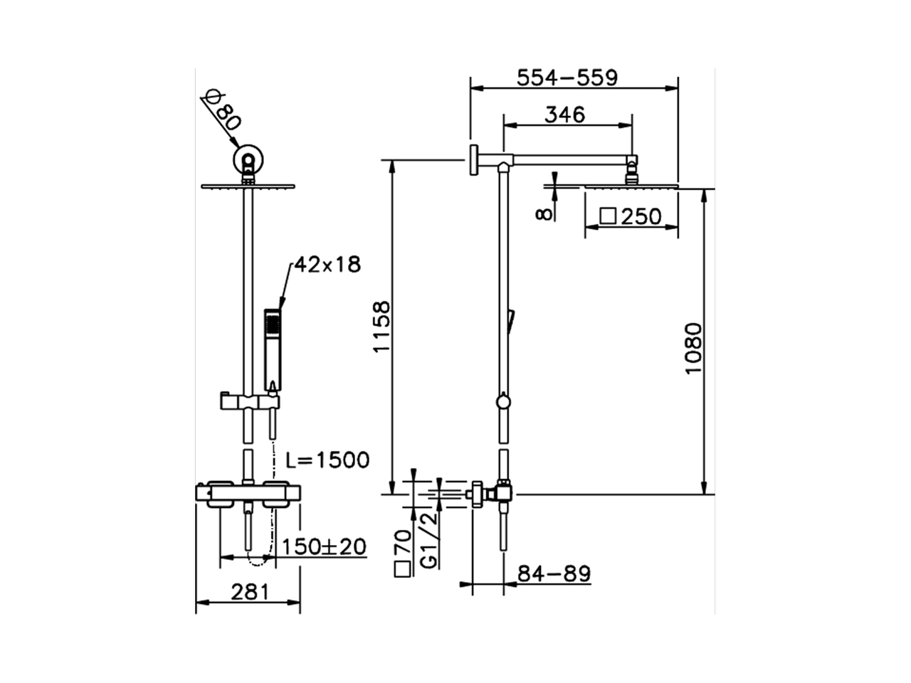Thermostatic shower column, 2-function,2-outlet deviastop,not adjustable riser column,sliding handshower holder,42x18 mm ABS Quad one spray handshower,250x250 mm BRASS square showerhead,150 cm smooth SILVERFLEX Flexible Hose