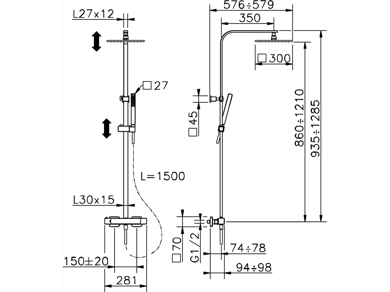 Thermostatic shower column, 2-function,2-outlet deviastop,adjustable riser column,sliding handshower holder,ABS 27x27mm one spray minimalist square handshower,300x300 BRASS Square headshower,150 cm smooth SILVERFLEX Flexible Hose