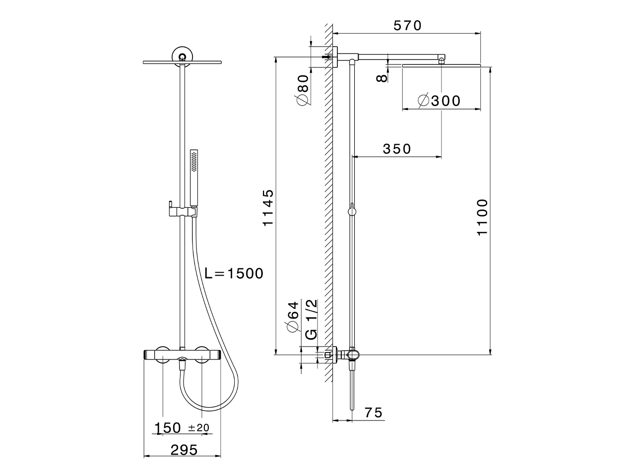 Thermostatic shower column, 2-function,2-outlet deviastop,not adjustable riser column,Sliding handshower holder,minimalistic one spray flat handshower ABS,300 mm Brass round headshower,150 cm smooth SUPREME Flexible Hose